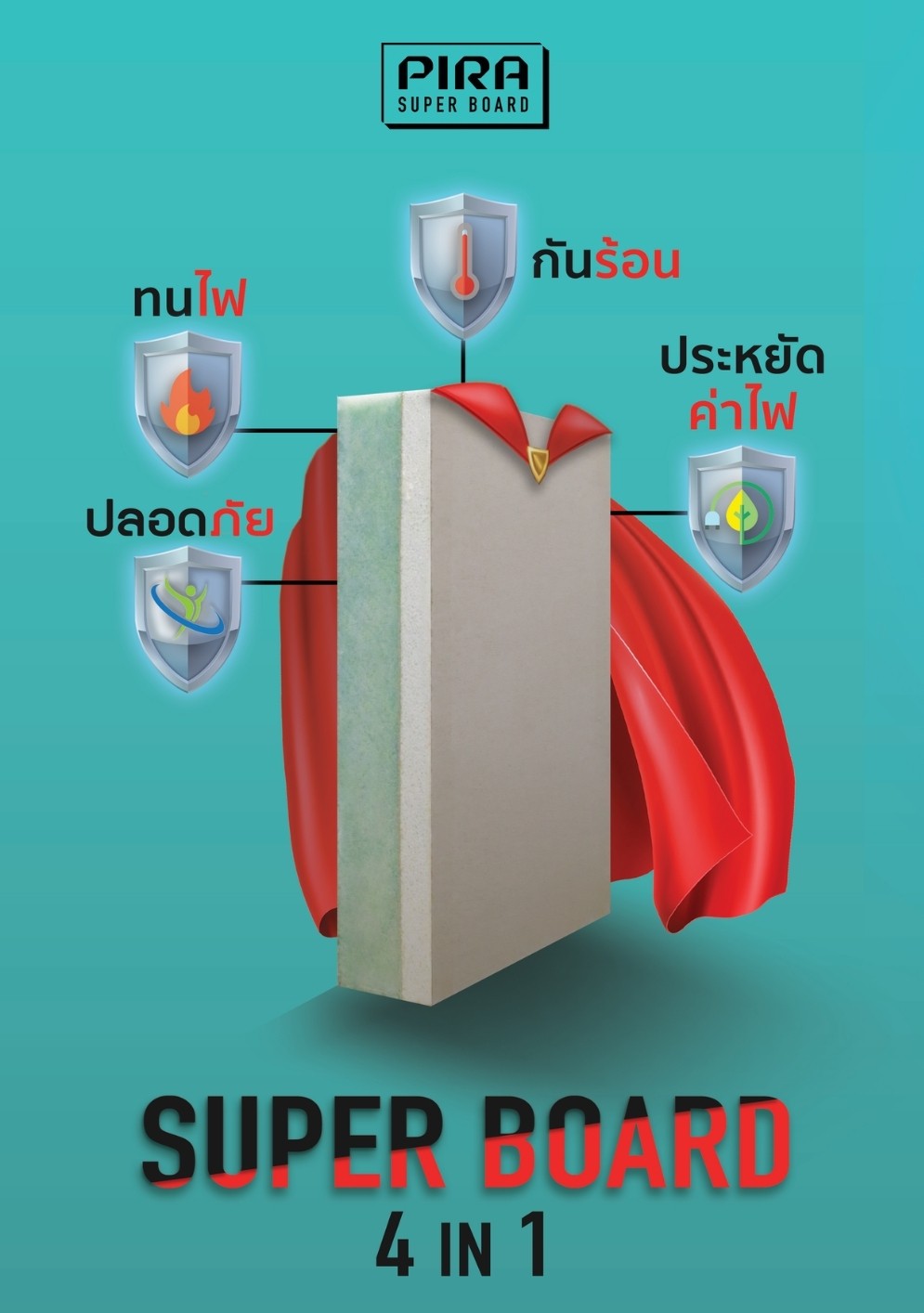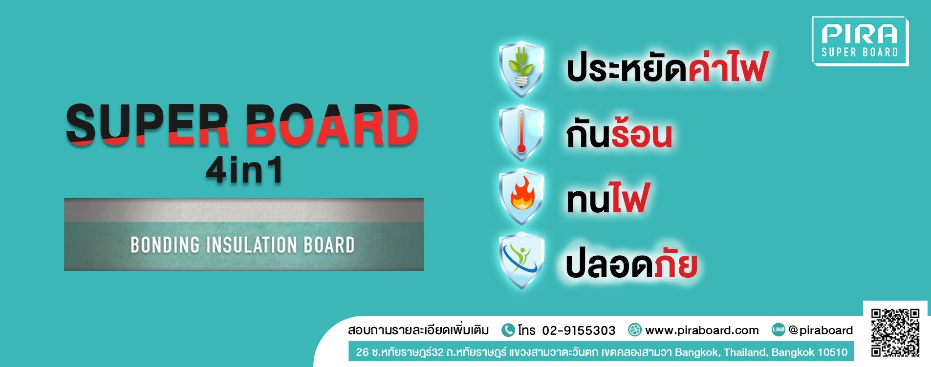 เรามุ่งมั่นพัฒนา PIRA SUPER BOARD แผ่นฝ้าและผนังติดฉนวน PIR Foam ซึ่งเป็นฉนวนกันความร้อนคุณภาพสูงสุดในวงการปัจจุบัน ช่วยลดอุณหภูมิในบ้านหรืออาคาร ทำให้เย็นสบาย ประหยัดไฟฟ้า อีกทั้งยังปลอดภัย ไม่ติดไฟ และไม่มีส่วนผสมของเส้นใยทีก่อให้เกิดอันตรายต่อสุขภาพ